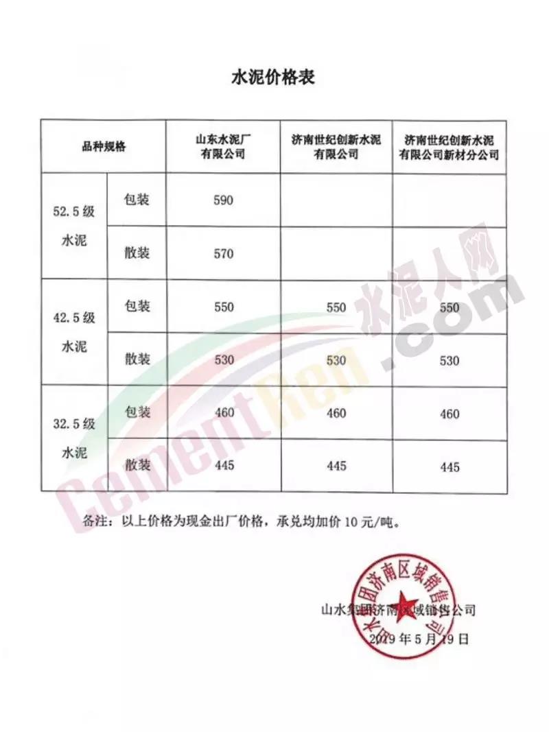 5月19日山水集團濟南區(qū)域銷售公司發(fā)布最新《水泥價格表》提到山東水泥廠有限公司、濟南世紀創(chuàng)新水泥有限公司、濟南世紀創(chuàng)新水泥有限公司新材分公司等三家企業(yè)執(zhí)行最新價格。