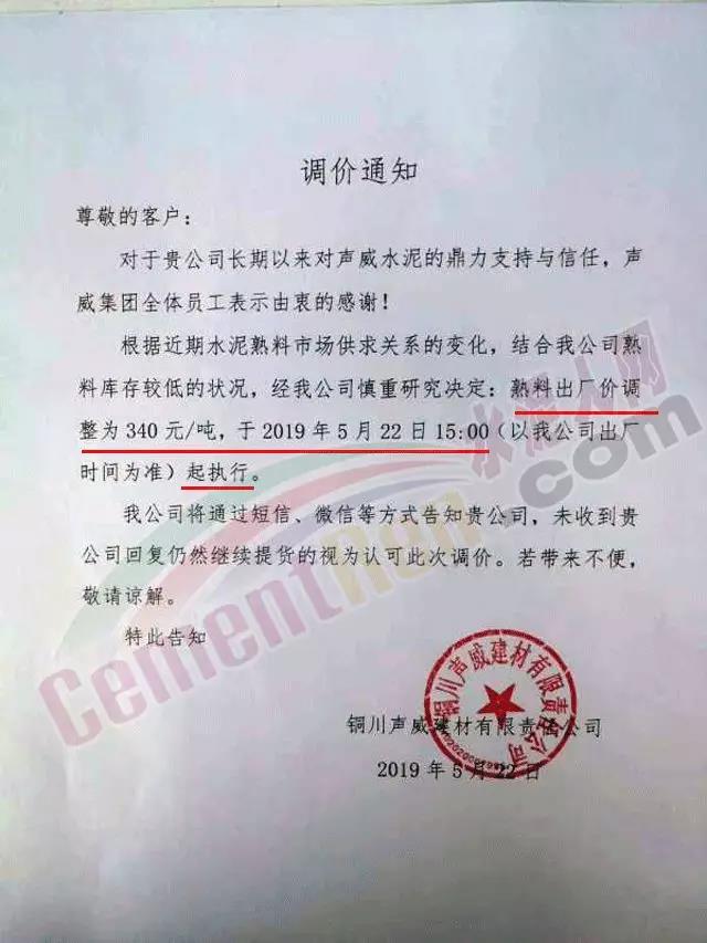 5月22日陜西銅川聲威建材上調熟料出廠價格。宜