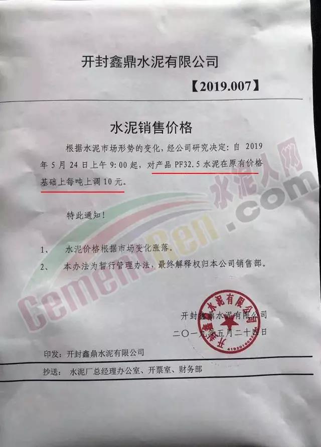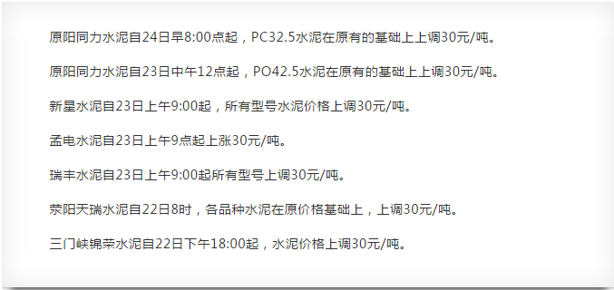 水泥大省河南地區(qū),自5月1日以來,同力水泥、孟電水泥、天瑞水泥、春江水泥等20多家水泥企業(yè)宣布漲價,單次漲價幅度在30元/噸左右。部分漲價通知如下: