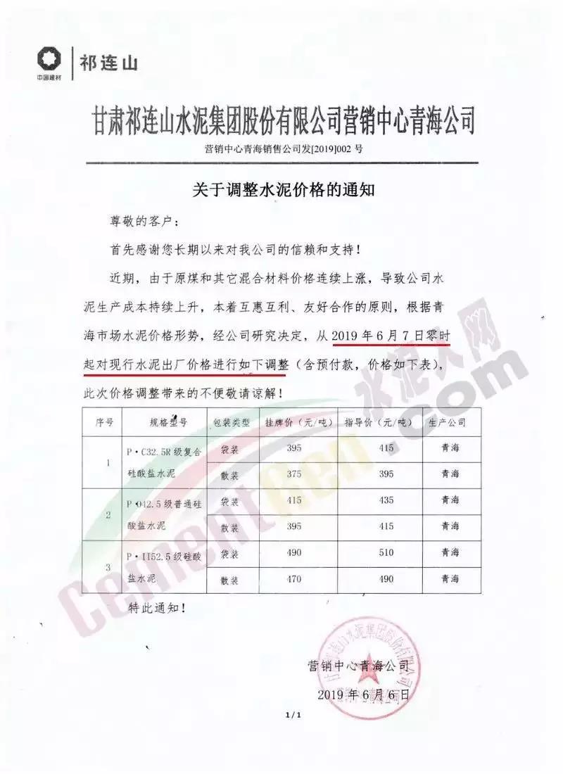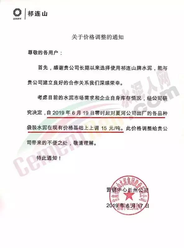 6月19日零時起甘肅祁連山水泥營銷中心蘭州公司對夏河公司出廠的各品種袋裝水泥在現(xiàn)有價格基礎上上調15元/噸。