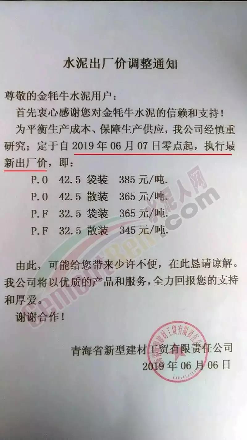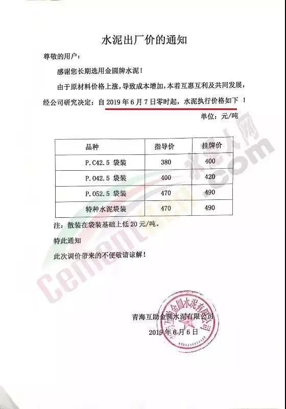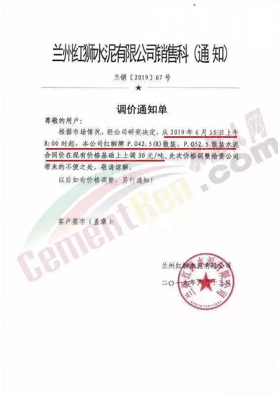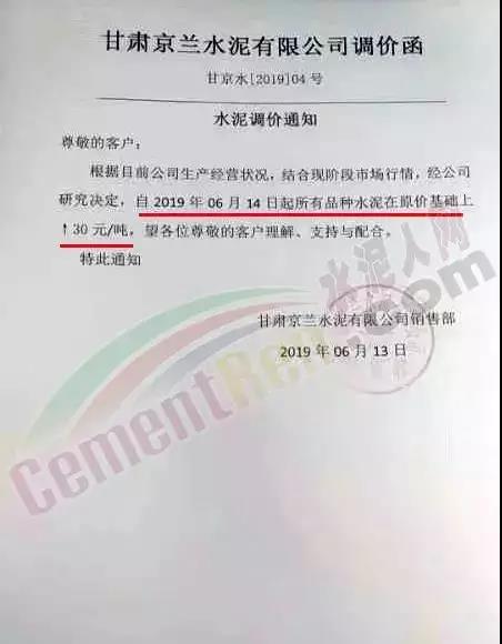 自2019年以來,西北地區(qū)的水泥價格一直處于平衡狀態(tài),上漲無力,而自5月份以來,甘肅地區(qū)的水泥價格出現(xiàn)不同程度的上漲,最高上漲30元/噸。部分漲價通知如下: