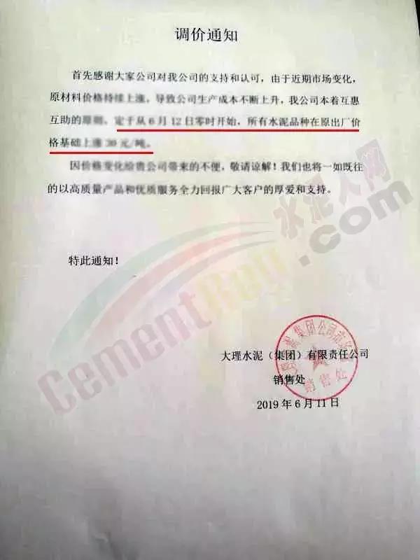 6月12日大理水泥(集團)有限公司各品種水泥價格上調30元/噸