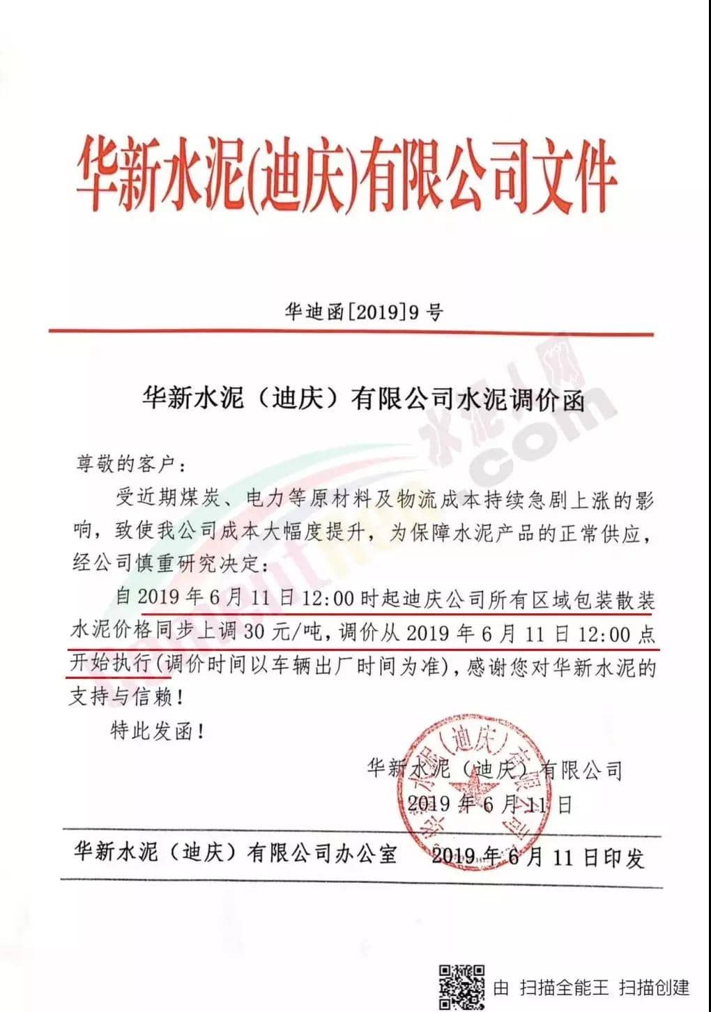 6月11日華新水泥(劍川)有限公司、華新水泥(迪慶)有限公司等水泥價格上調30元/噸