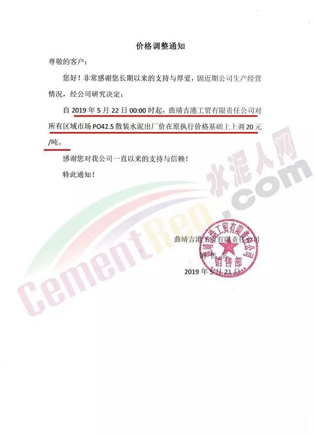 5月22日曲靖吉港工貿(mào)有限責任公司42.5級散裝水泥上調20元/噸