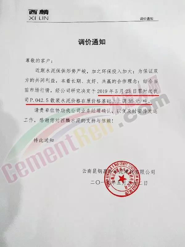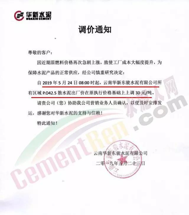 5月24日云南華新東駿水泥有限公司42.5散裝水泥上調30元/噸。