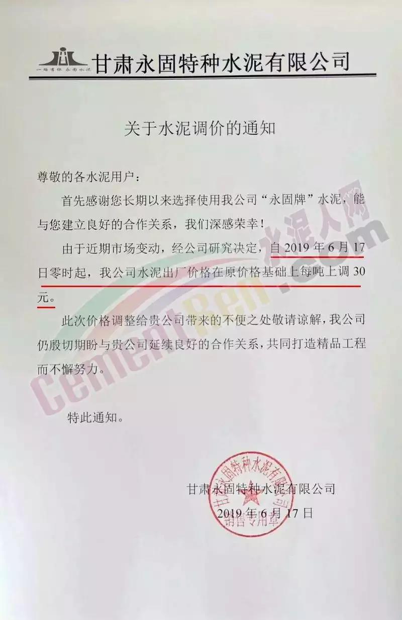 6月17日甘肅永固特種水泥有限公司水泥出廠價格在原價格基礎上每噸上調30元