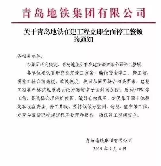 另據(jù)相關方面最新消息,青島地鐵當日已經(jīng)下發(fā)通知立即全面停工整頓,涉所有在建線路,要求各單位研究制定停工方案,確保安全停工。