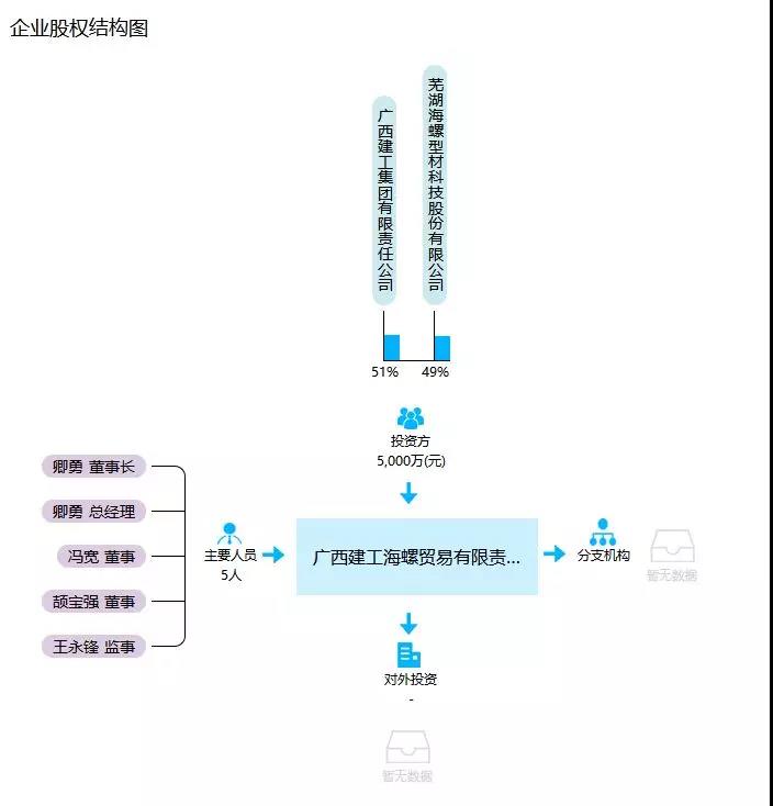 據(jù)水泥人網(wǎng)了解,廣西建工海螺貿(mào)易有限公司于今年(2019年)1月3日由廣西建工集團(tuán)有限責(zé)任公司和蕪湖海螺型材科技股份有限公司共同出資注冊成立。其中廣西建工集團(tuán)有限責(zé)任公司持股51%,蕪湖海螺型材科技股份有限公司持股49%。