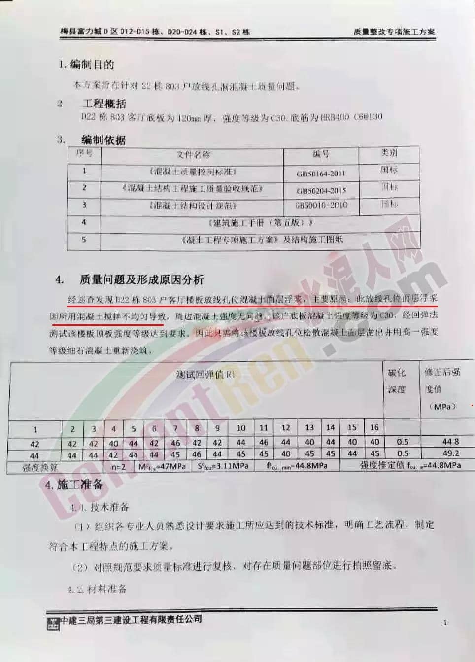 該質(zhì)量整改項(xiàng)施工方案中指出:經(jīng)巡查發(fā)現(xiàn)D22棟803戶客廳樓板放線孔位混凝土面層浮槳因所用混凝土攪拌不均勻?qū)е?,周邊混凝土?qiáng)度無問題,一句輕描淡寫的話就給此事劃上了句號。
