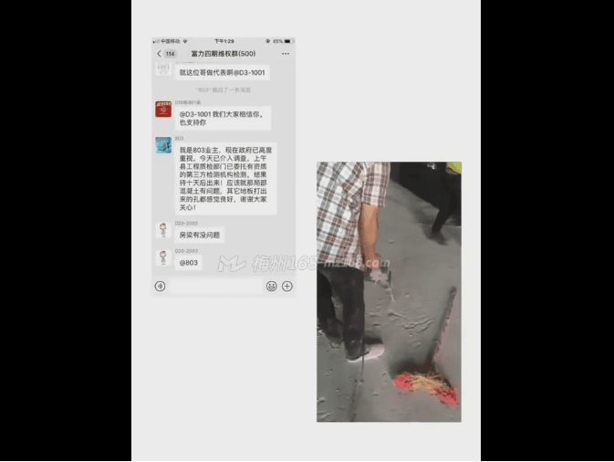 據(jù)梅州富力城4期初業(yè)主表示:昨晚該視頻在微信群傳開了,出于對自身房屋的擔(dān)憂,還特意去檢測了下自己的房子,幸好沒發(fā)現(xiàn)問題。“可能是不同時(shí)期建造的房子,混凝土質(zhì)量不一樣。” 該業(yè)主表示。
