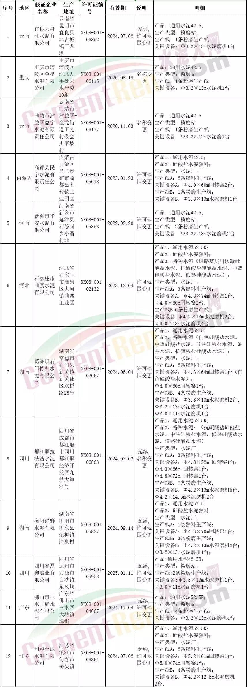 2019年7月第一批水泥企業(yè)生產(chǎn)許可證名單