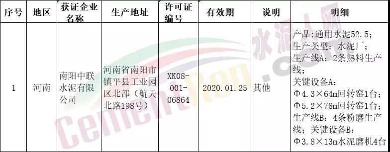 本期發(fā)放生產(chǎn)許可證的南陽(yáng)中聯(lián)水泥有限公司生產(chǎn)地址位于河南省南陽(yáng)市鎮(zhèn)平縣工業(yè)園區(qū)北部(航天北路198號(hào))發(fā)證說(shuō)明為“其他”。據(jù)水泥人網(wǎng)了解,南陽(yáng)中聯(lián)水泥有限公司2018年12月29日舉行了揭牌儀式,中國(guó)聯(lián)合水泥集團(tuán)有限公司南陽(yáng)分公司正式變更為具有獨(dú)立法人資格的南陽(yáng)中聯(lián)水泥有限公司。國(guó)家市場(chǎng)監(jiān)管總局七月第一批生產(chǎn)許可證發(fā)放詳情如下: