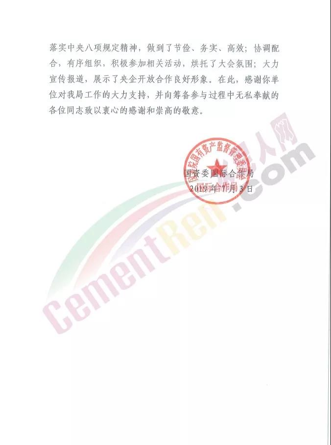 日前,國務(wù)院國有資產(chǎn)監(jiān)督管理委員會發(fā)感謝信給中國建材集團有限公司稱:作為中非經(jīng)貿(mào)博覽會布展單位 ,中國建材集團領(lǐng)導(dǎo)高度重視,積極響應(yīng)號召參展參會,有力凸顯了央企責任擔當;投入大量精力和心血精心設(shè)計展覽展示方寧,翔實展示企業(yè)合作成績;堅持貫徹落實中央八項規(guī)定精神,做到了節(jié)儉、務(wù)實、高效;協(xié)調(diào)配合,有序組織 ,積極參加相關(guān)活動,烘托了大會氛圍;大力宣傳報道,展示了央企開放合作良好形象。感謝信原文如下:
