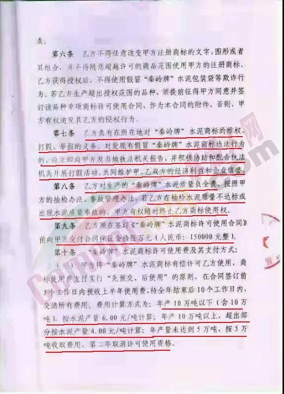 據(jù)水泥人網(wǎng)了解,其品牌授權(quán)生產(chǎn)經(jīng)營(yíng)協(xié)議中有明確質(zhì)量及品牌使用要求。商標(biāo)使用者應(yīng)保證使用該注冊(cè)商標(biāo)的商品質(zhì)量,具體措施為:“秦嶺牌”水泥商標(biāo)許可使用范圍為商標(biāo)使用者生產(chǎn)的各標(biāo)號(hào)普通硅酸鹽水泥產(chǎn)品;商標(biāo)使用者生產(chǎn)的“秦嶺牌”各標(biāo)號(hào)水泥,必須嚴(yán)格執(zhí)行商標(biāo)使用者“秦嶺牌”水泥生產(chǎn)內(nèi)控標(biāo)準(zhǔn)和要求。在生產(chǎn)過(guò)程中,耀縣水泥廠行使質(zhì)量否決權(quán);商標(biāo)使用者在生產(chǎn)“秦嶺牌”水泥的過(guò)程中,所購(gòu)買的水泥熟料質(zhì)量必須符合耀縣水泥廠對(duì)熟料質(zhì)量的內(nèi)控標(biāo)準(zhǔn)和要求,保證水泥產(chǎn)品質(zhì)量100%合格。