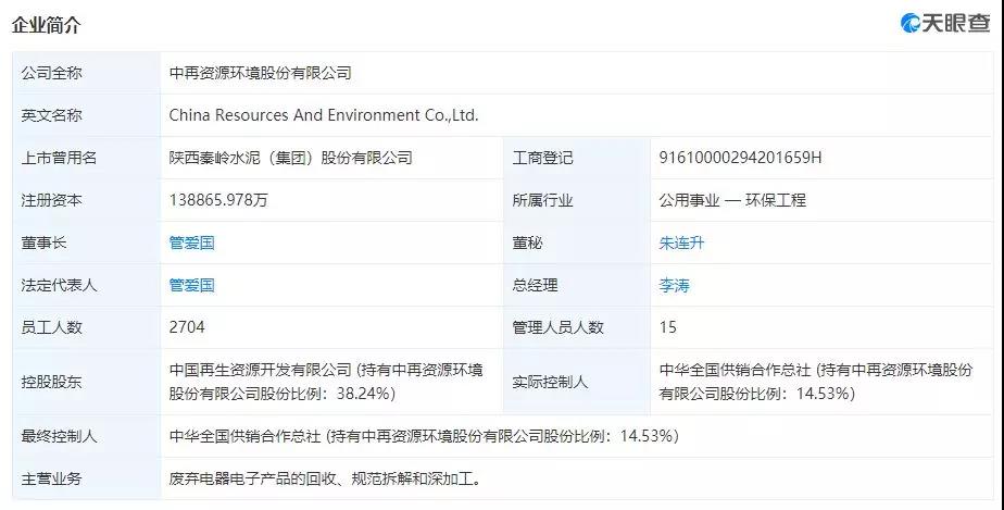 中再資源環(huán)境股份有限公司,其主營(yíng)業(yè)務(wù)為廢棄電器電子產(chǎn)品的回收、規(guī)范拆解和深加工。實(shí)際控制人為中華全國(guó)供銷合作總社 (持有中再資源環(huán)境股份有限公司股份比例:14.53%)企業(yè)并沒(méi)有生產(chǎn)水泥的資質(zhì)。