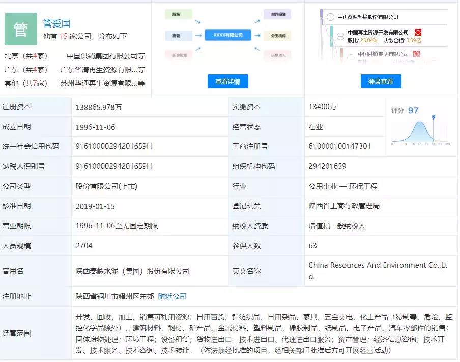 據(jù)查詢,這家名為陜西秦嶺水泥的集團(tuán)公司已改名為中再資源環(huán)境股份有限公司。