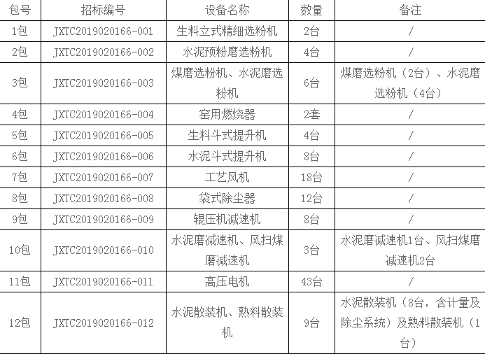 包12:近五年(2014年1月1日以來(lái))內(nèi)投標(biāo)人在中國(guó)大陸至少有兩個(gè)生產(chǎn)能力4000噸/天及以上熟料水泥生產(chǎn)線或年產(chǎn)100萬(wàn)噸及以上水泥粉磨站同類設(shè)備供貨業(yè)績(jī)(含改造項(xiàng)目)。