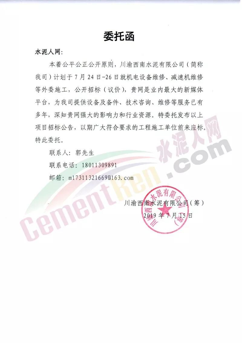 川渝西南公司擬對下屬的四川區(qū)域、重慶區(qū)域39家熟料、水泥生產企業(yè),進行2019年度機電設備維修、減速機維修等外委施工招議標,通過公開邀請招標選擇資質合格、保供能力強、質量及技術服務均受控的供貨單位?,F將相關招標采購信息發(fā)布如下: