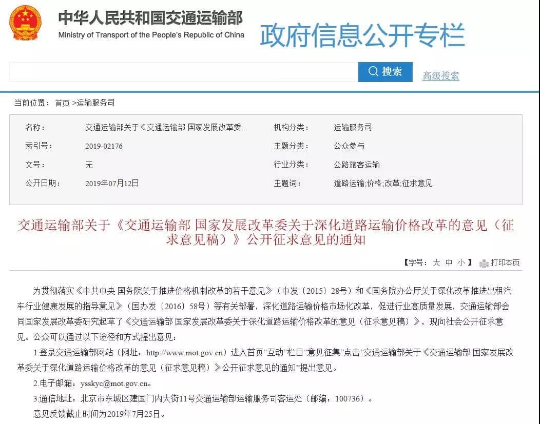 7月12日交通運(yùn)輸部官網(wǎng)發(fā)布《交通運(yùn)輸部國家發(fā)展改革委關(guān)于深化道路運(yùn)輸價(jià)格改革的意見(征求意見稿)》其中提到深化道路運(yùn)輸價(jià)格市場化改革,促進(jìn)行業(yè)高質(zhì)量發(fā)展,交通運(yùn)輸部會同國家發(fā)展改革委研究起草了《交通運(yùn)輸部 國家發(fā)展改革委關(guān)于深化道路運(yùn)輸價(jià)格改革的意見(征求意見稿)》其改革目標(biāo)為到2020年,道路運(yùn)輸競爭性領(lǐng)域和環(huán)節(jié)價(jià)格基本放開,保留實(shí)行政府定價(jià)、政府指導(dǎo)價(jià)的道路運(yùn)輸價(jià)格動(dòng)態(tài)調(diào)整機(jī)制有效建立,道路客運(yùn)、出租汽車等領(lǐng)域經(jīng)營者價(jià)格行為更加規(guī)范,主要由市場決定的道路運(yùn)輸價(jià)格形成機(jī)制和科學(xué)、規(guī)范、透明的道路運(yùn)輸價(jià)格監(jiān)管制度基本健全,價(jià)格機(jī)制引導(dǎo)資源配置、促進(jìn)行業(yè)高質(zhì)量發(fā)展、滿足人民群眾出行需求的作用明顯增強(qiáng)。上述意見自2019年11月1日起實(shí)行。