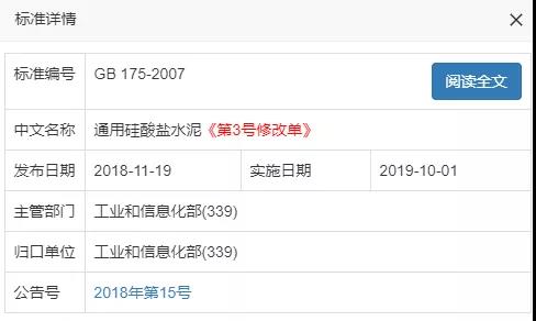 中華人民共和國國家標(biāo)準(zhǔn)公告(2018年第15號)《GB175-2007通用硅酸鹽水泥(第3號修改單)》是由國家市場監(jiān)督管理總局、國家標(biāo)準(zhǔn)化管理委員會批準(zhǔn)自2019年10月1日起正式實(shí)施的。3號修改單的主要內(nèi)容是“全面取消32.5復(fù)合硅酸鹽水泥”。