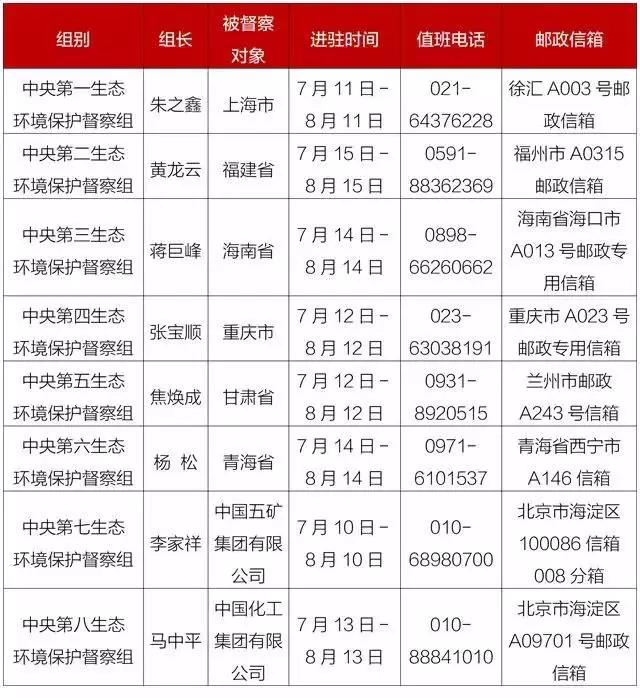 第二輪第一批中央生態(tài)環(huán)境保護(hù)督察進(jìn)駐一覽表