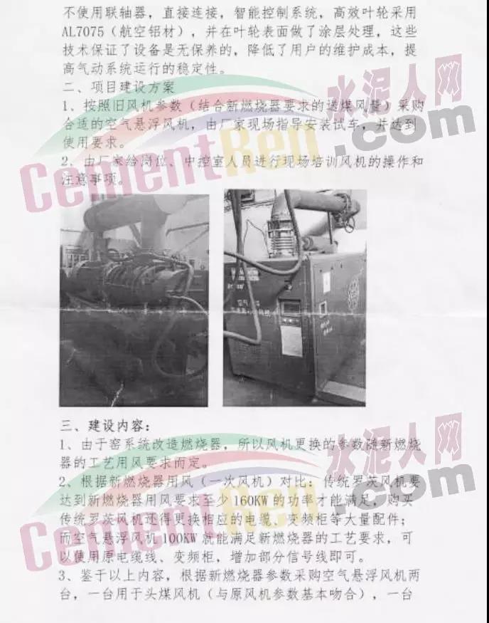 2、窯頭空氣懸浮風(fēng)機(jī):因燃燒器改造后風(fēng)壓要求高于原燃燒器一倍,訂購空氣懸浮風(fēng)機(jī)時(shí)按照新燃燒器設(shè)計(jì)參數(shù)采購,對(duì)比實(shí)際參數(shù)做功時(shí)按照空氣懸浮風(fēng)機(jī)風(fēng)壓、流量接近于原羅茨風(fēng)機(jī)進(jìn)行,上圖中標(biāo)黃數(shù)據(jù)為接近原羅茨風(fēng)機(jī)的參數(shù)和用電量;根據(jù)對(duì)比節(jié)電率為30.5%,達(dá)到合同簽訂要求。
