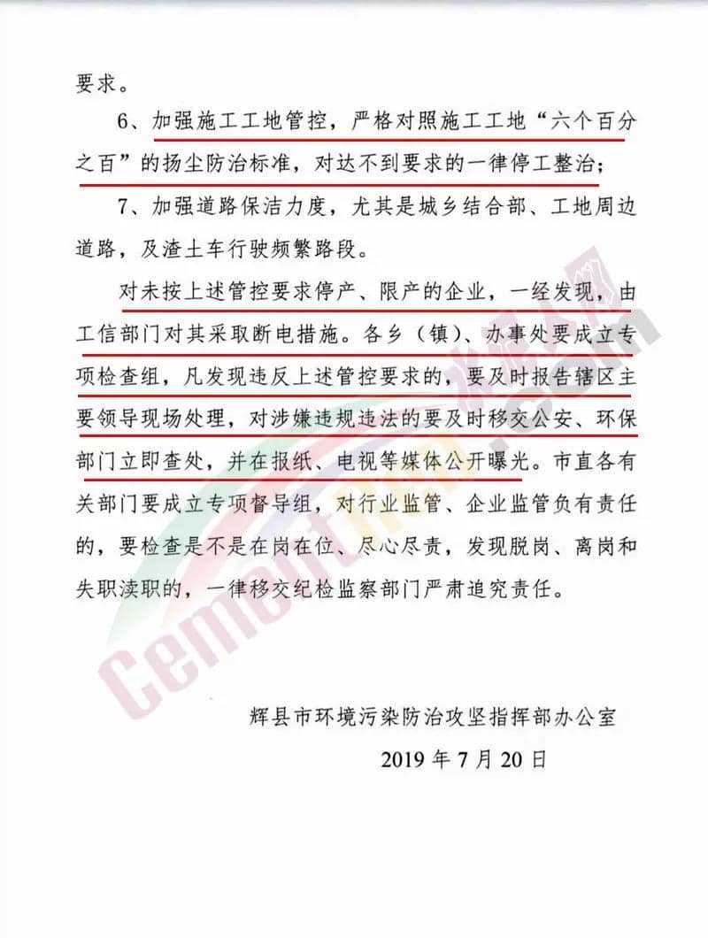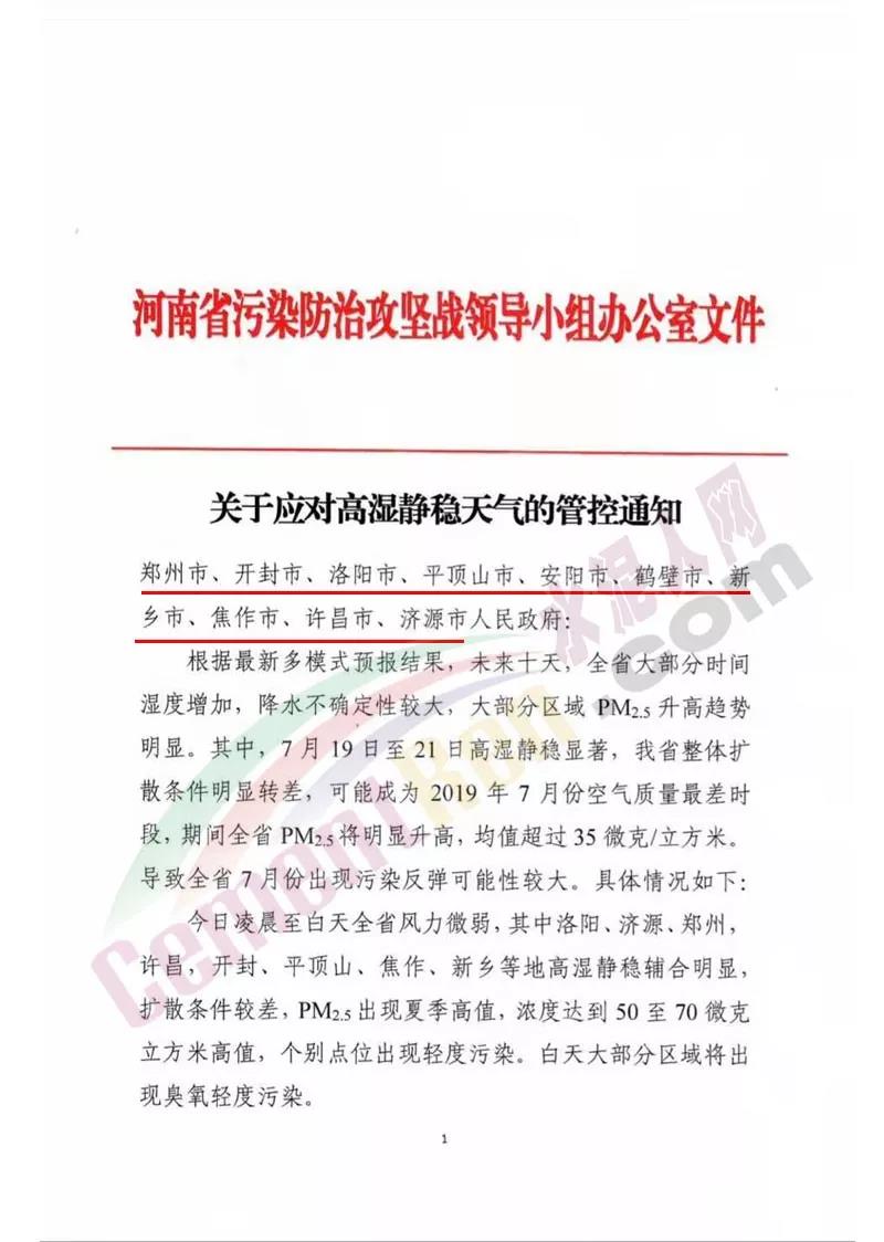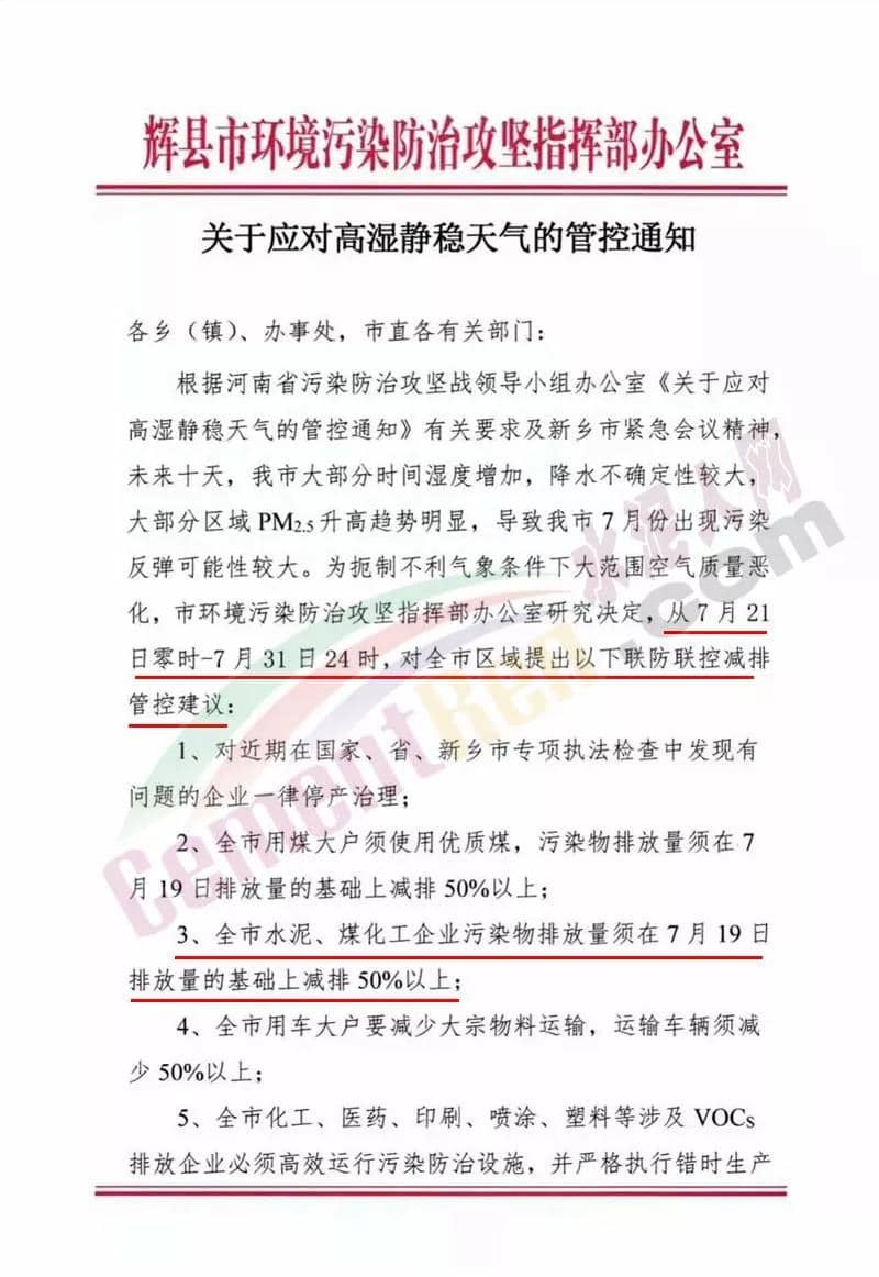 同日,輝縣市環(huán)境污染防治攻堅指揮部發(fā)布《關(guān)于應(yīng)對高濕靜穩(wěn)天氣的管理通知》稱,根據(jù)河南省污染防治攻堅領(lǐng)導(dǎo)小組辦公室文件要求及新鄉(xiāng)市緊急會議精神,為扼制不利氣象條件下大范圍空氣質(zhì)量惡化,輝縣市環(huán)境污染防治攻堅指揮部辦公室決定從7月21日零時至7月31日24時,對全市區(qū)域提出聯(lián)防聯(lián)控減排管控建議,全市水泥、煤化工企業(yè)污染物排放量須在7月19日排放量的基礎(chǔ)上減排50%以上。