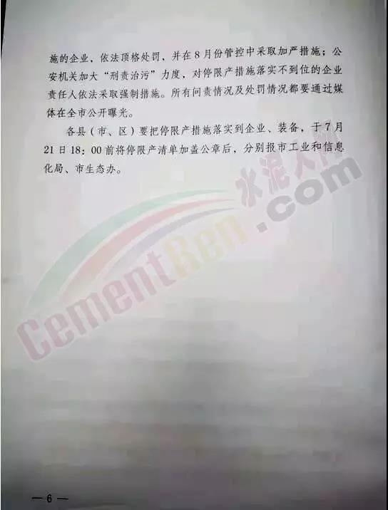 處置污泥的企業(yè)按照核定的最低負(fù)荷生產(chǎn),保障重點(diǎn)工程、“一港雙城”項(xiàng)目、水曹鐵路的水泥企業(yè)定向生產(chǎn)供應(yīng),其余企業(yè)停產(chǎn);他行業(yè)。全市粉磨站、磚瓦窯、鋼鍬等企業(yè),在執(zhí)行7月份管控措施基礎(chǔ)上7月26、27、28日全部停產(chǎn)。