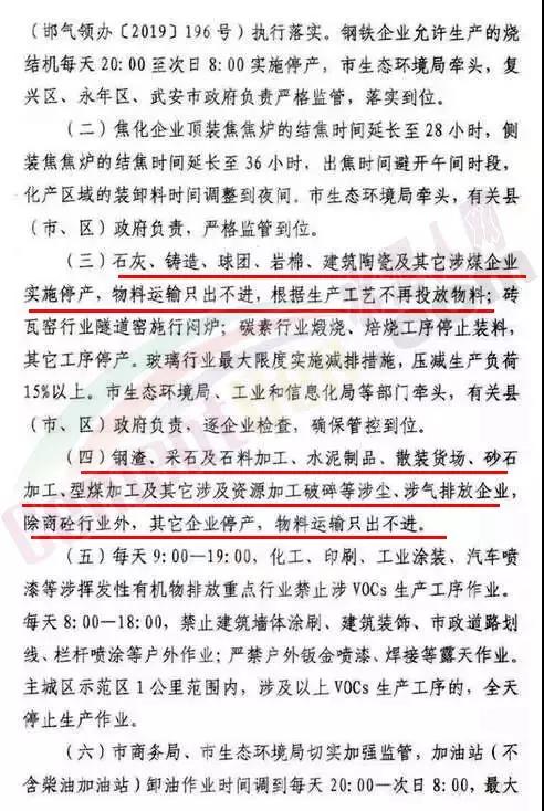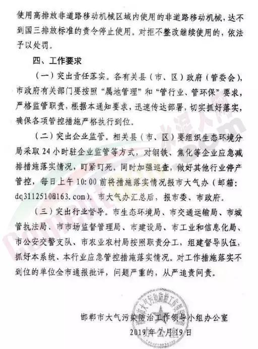同期,邯鄲市大氣污染防治工作領(lǐng)導(dǎo)小組辦公室也發(fā)布了緊急通知,邯鄲市于2019年7月19日20.00-7月26日20:00,對主城區(qū)及周邊執(zhí)行大氣污染防治強(qiáng)化應(yīng)急管控措施。管控地區(qū)包括邯山區(qū)、復(fù)興區(qū)、邯都經(jīng)濟(jì)技術(shù)開發(fā)區(qū)、冀南新區(qū)、永年區(qū)、武安市、磁縣、成安縣、臨潭縣。