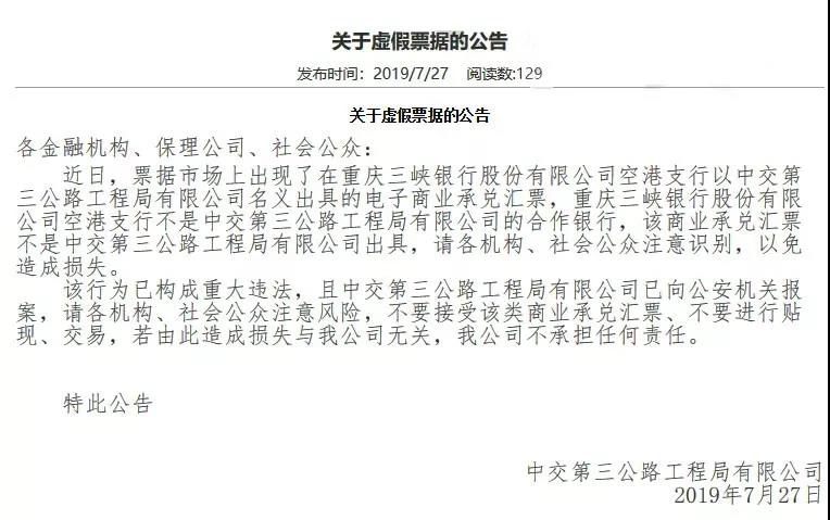 近日,票據(jù)市場(chǎng)上出現(xiàn)了重慶三峽銀行股份有限公司空港支行以中交第三公路工程局有限公司名義出具的電子商業(yè)承兌匯票,重慶三峽銀行股份有限公司空港支行不是中交第三公路工程局有限公司的合作銀行,該商業(yè)承兌匯票不是中交第三公路工程局有限公司出具,請(qǐng)各機(jī)構(gòu)、社會(huì)公眾注意識(shí)別,以免造成損失。