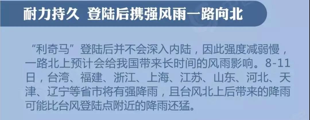 持續(xù)時間長——臺風“利奇馬”未來登陸中國后,也并不會深入內(nèi)陸,強度減弱慢,比較有利于維持臺風環(huán)流,一路北上預計會給中國帶來長時間風雨影響。