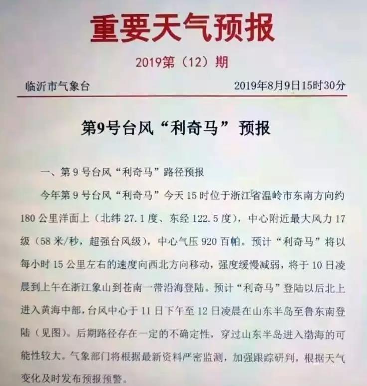 山東省氣象局發(fā)布第9號臺風“利奇馬”預報稱,預計臺風中心于11日下午至12日凌晨在山東半島至魯東南登陸。后期路徑存在一定的不確定性,穿過山東半島進入渤海的可能性較大。預計“利奇馬”外圍 云“系于10日下午開始影響山東省。