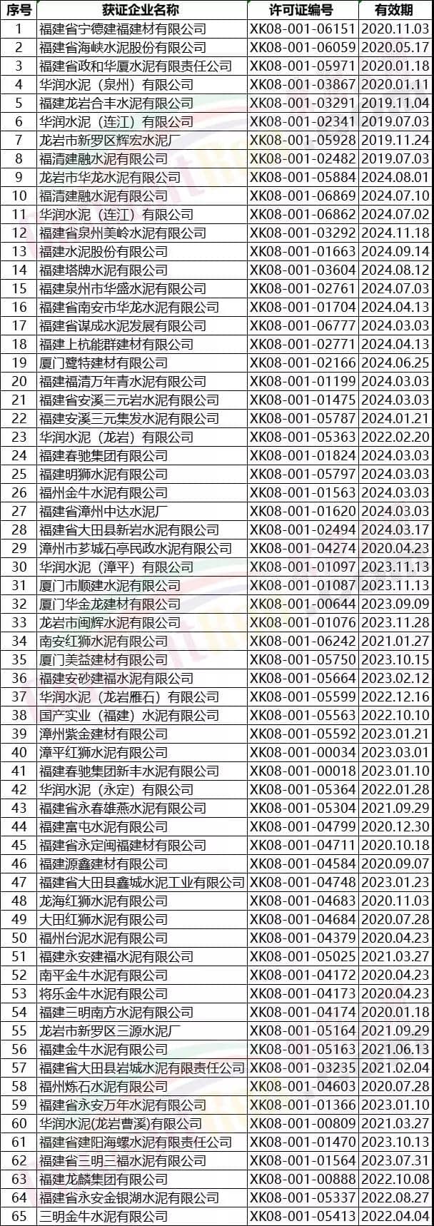 福建省部分水泥企業(yè)名單