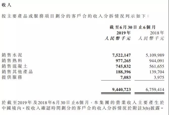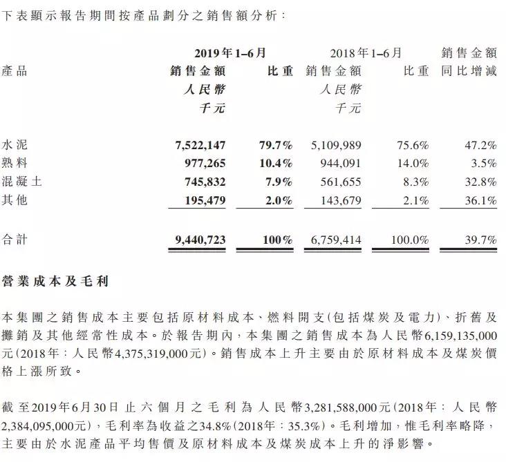 公告顯示,截至2019年6月30日,集團(tuán)水泥產(chǎn)能1億噸,熟料產(chǎn)能5107萬噸,商品混凝土產(chǎn)能1930萬立方米。報告期內(nèi),集團(tuán)銷售水泥、熟料合計2393.2萬噸,同比增加27.8%。