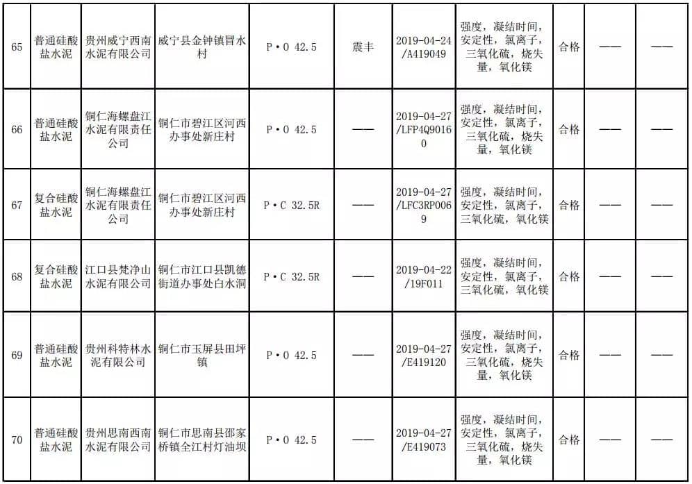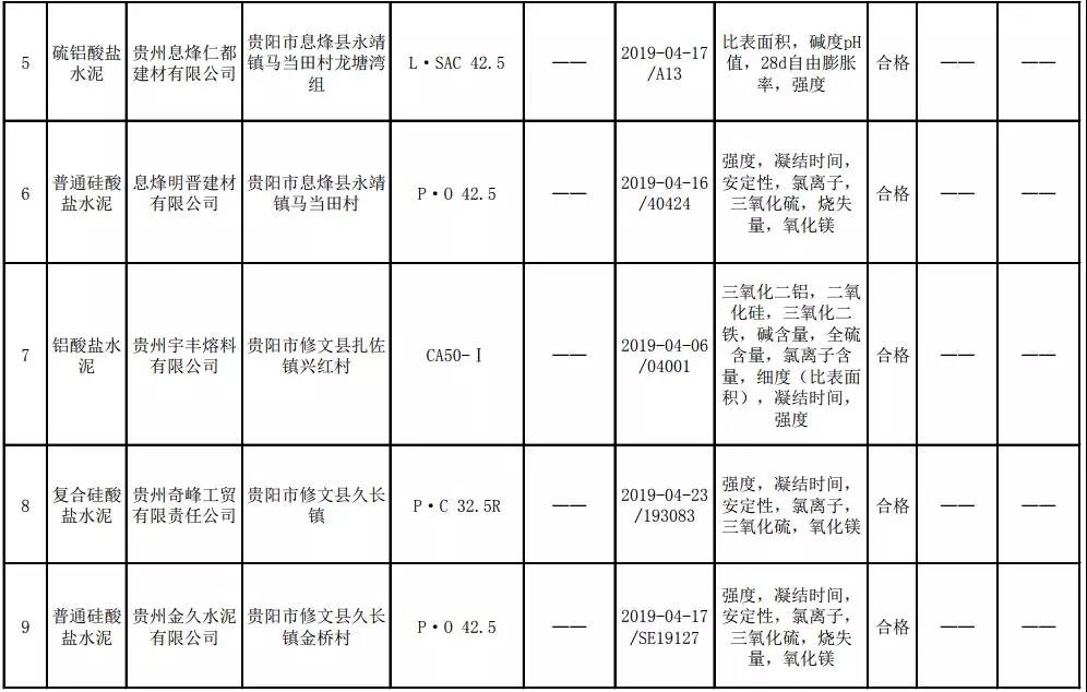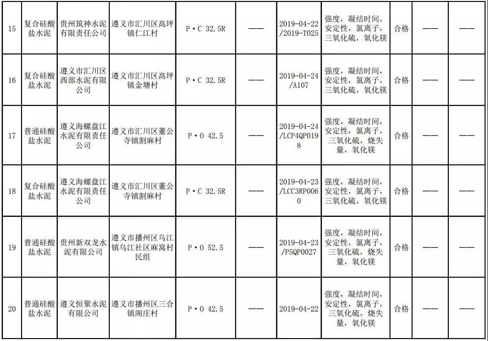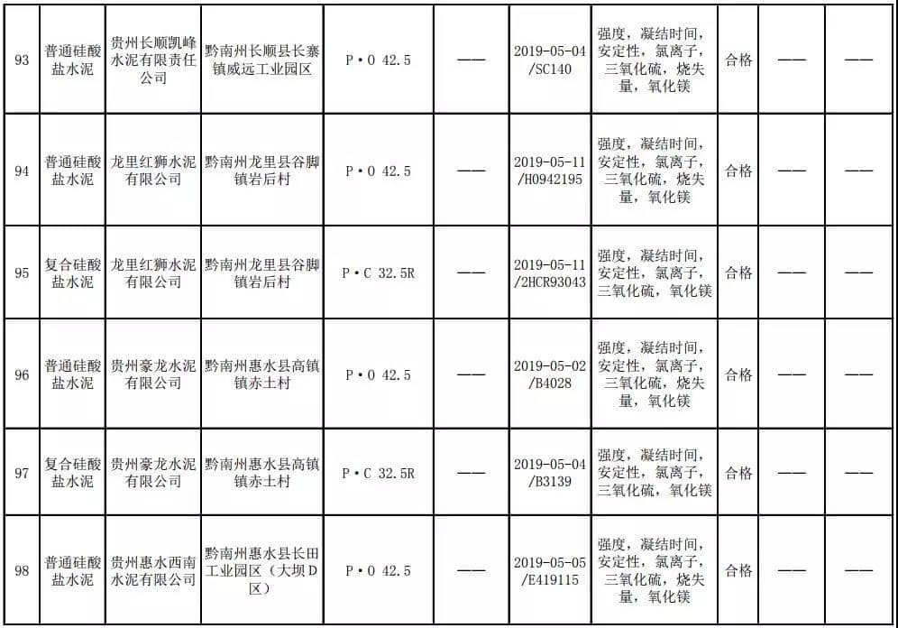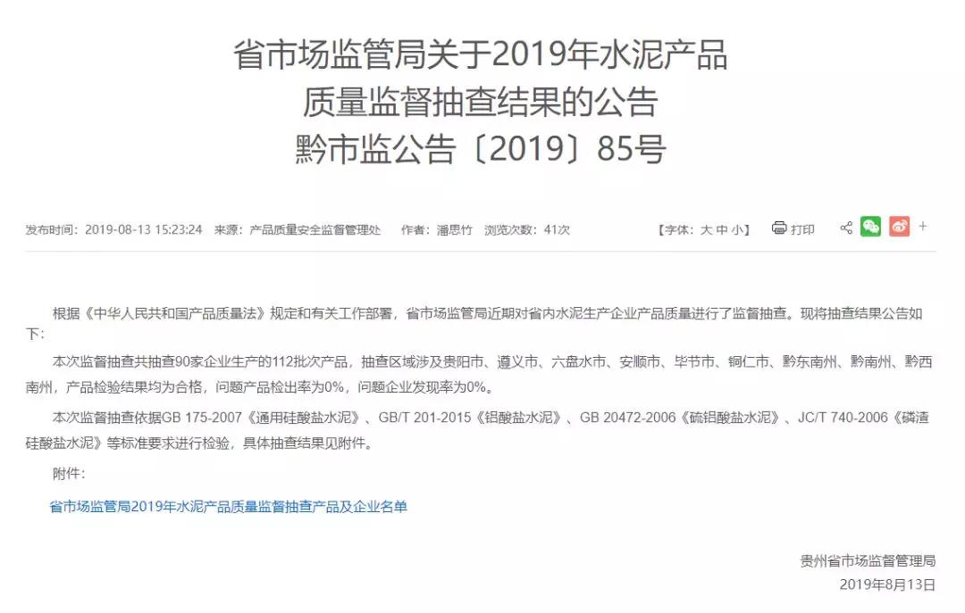 2019年8月13日,貴州省市場(chǎng)監(jiān)督管理局網(wǎng)站公布2019年水泥產(chǎn)品質(zhì)量監(jiān)督抽查結(jié)果。本次監(jiān)督抽查共抽查90家企業(yè)生產(chǎn)的112批次產(chǎn)品,抽查區(qū)域涉及貴陽(yáng)市、遵義市、六盤水市、安順市、畢節(jié)市、銅仁市、黔東南州、黔南州、黔西南州,產(chǎn)品檢驗(yàn)結(jié)果均為合格,問(wèn)題產(chǎn)品檢出率為0%,問(wèn)題企業(yè)發(fā)現(xiàn)率為0%。