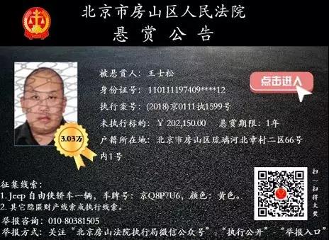 房山法院發(fā)布的另一起因不履行民間借貸糾紛案件判決結(jié)果而發(fā)布的懸賞公告, 被執(zhí)行人王士松,44歲,家住北京市房山區(qū)琉璃河北章村二區(qū)66號(hào)內(nèi)1號(hào)。其因“手頭緊”向朋友借款20萬元后不再歸還,被朋友告上法庭,后在法院判令其還款后仍不履行判決,被法院列入懸賞公告。
