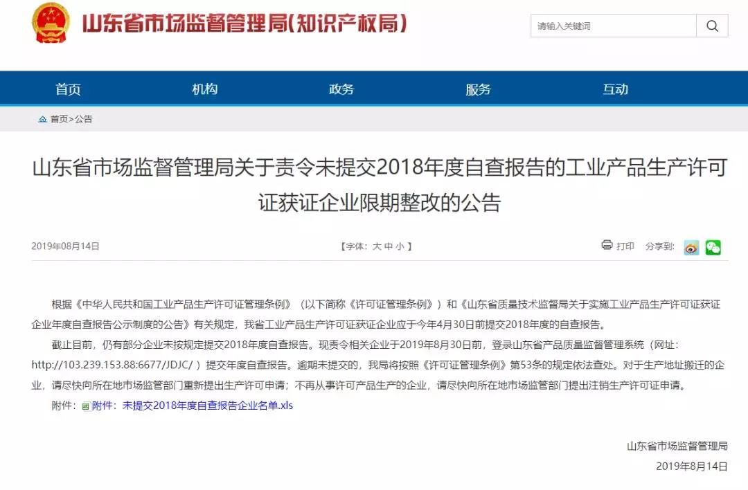 日前,山東省市場監(jiān)督管理局發(fā)布公告文件稱:根據(jù)《中華人民共和國工業(yè)產(chǎn)品生產(chǎn)許可證管理條例》(以下簡稱《許可證管理條例》)和《山東省質(zhì)量技術(shù)監(jiān)督局關(guān)于實施工業(yè)產(chǎn)品生產(chǎn)許可證獲證企業(yè)年度自查報告公示制度的公告》有關(guān)規(guī)定,山東省工業(yè)產(chǎn)品生產(chǎn)許可證獲證企業(yè)應于今年4月30日前提交2018年度的自查報告。