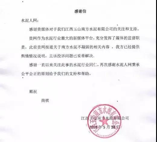 水泥人網(wǎng)報(bào)道的關(guān)于南方水泥不凝固的相關(guān)問題,引起了南方水泥的高度重視,隨后江西玉山南方水泥與用戶積極溝通,在最短的時(shí)間內(nèi)為用戶解決了相關(guān)問題。江西玉山南方水泥有限公司對(duì)于水泥人網(wǎng)的作法表示高度認(rèn)可,并表示,水泥人網(wǎng)作為行業(yè)最大的新媒體平臺(tái),充分發(fā)揮了媒體的監(jiān)督職責(zé),感謝水泥人網(wǎng)秉承公平公正的原則給矛江西玉山南方水泥的支持和幫助。