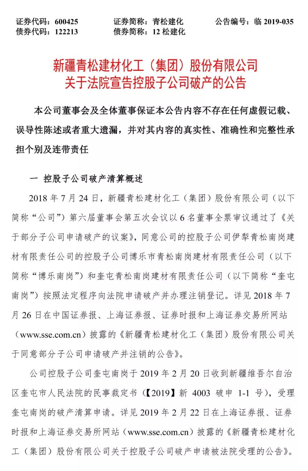 公司控股子公司奎屯南崗于2019年2月20日收到新疆維吾爾自治區(qū)奎屯市人民法院的民事裁定書(shū)(【2019】新4003破申1-1號(hào)),受理奎屯南崗的破產(chǎn)清算申請(qǐng)。詳見(jiàn)2019年2月22日在上海證券報(bào)、證券時(shí)報(bào)和上海證券交易所網(wǎng)站(www.sse.com.cn)披露的《新疆青松建材化工(集團(tuán))股份有限公司關(guān)于控股子公司破產(chǎn)申請(qǐng)被法院受理的公告》