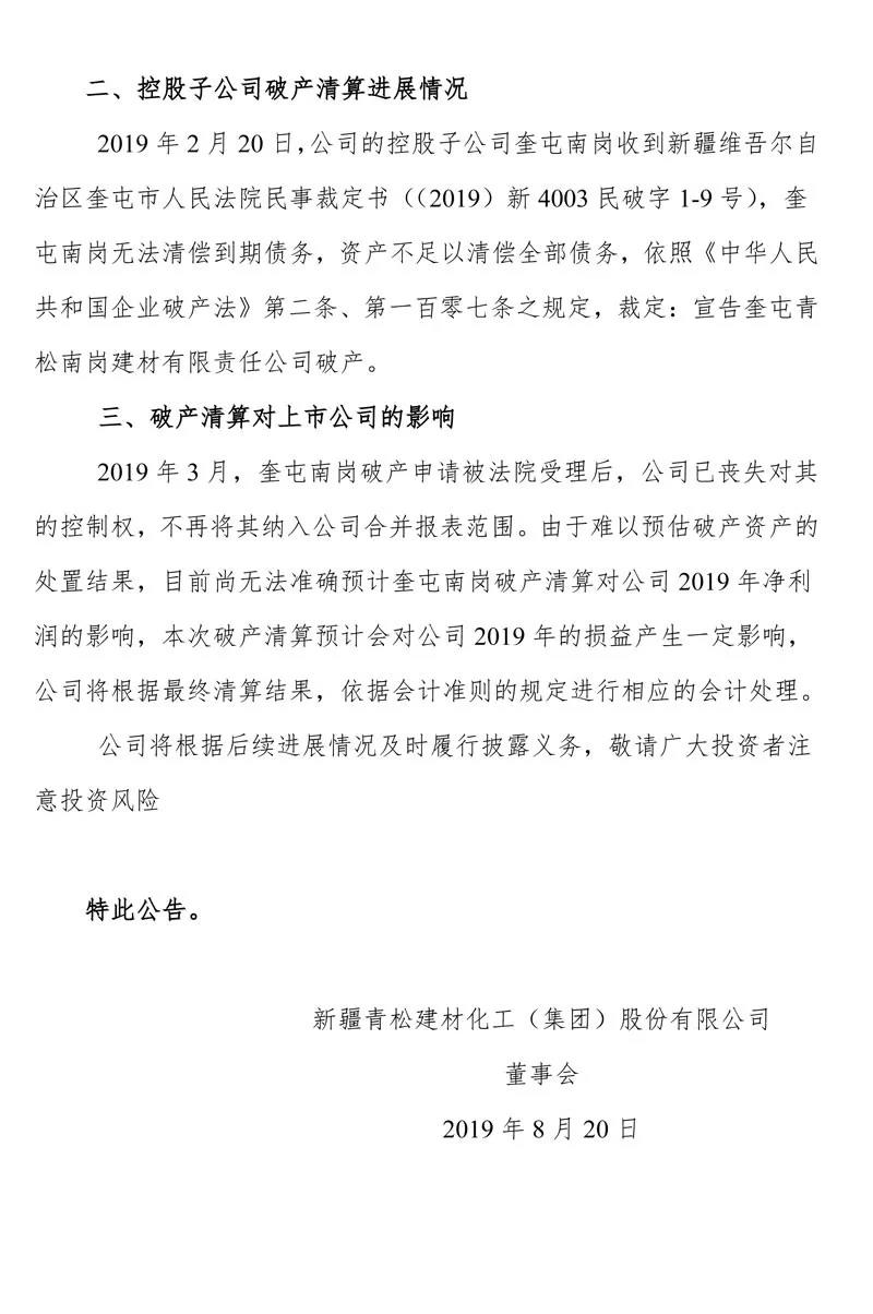 2019年3月,奎屯南崗破產(chǎn)申請(qǐng)被法院受理后,公司已喪失對(duì)其的控制權(quán),不再將其納入公司合并報(bào)表范圍。由于難以預(yù)估破產(chǎn)資產(chǎn)的處置結(jié)果,目前尚無(wú)法準(zhǔn)確預(yù)計(jì)奎屯南崗破產(chǎn)清算對(duì)公司2019年凈利潤(rùn)的影響,本次破產(chǎn)清算預(yù)計(jì)會(huì)對(duì)公司2019年的損益產(chǎn)生一定影響,公司將根據(jù)最終清算結(jié)果,依據(jù)會(huì)計(jì)準(zhǔn)則的規(guī)定進(jìn)行相應(yīng)的會(huì)計(jì)處理。公告原文如下: