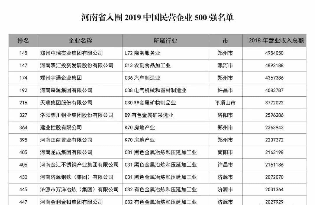 據(jù)悉,天瑞集團(tuán)以377.2億元營(yíng)收排名2019中國(guó)民營(yíng)企業(yè)500強(qiáng)第216位。今年河南共有13家企業(yè)上榜,天瑞集團(tuán)在河南上榜企業(yè)中排名第五。同時(shí),天瑞集團(tuán)還上榜2019中國(guó)民營(yíng)企業(yè)制造業(yè)500強(qiáng)第129位,名列18家河南上榜企業(yè)第四名。