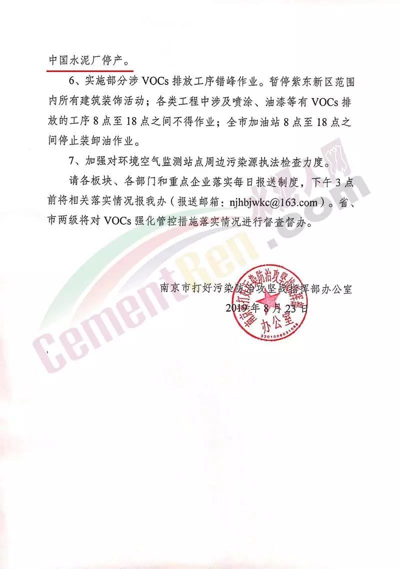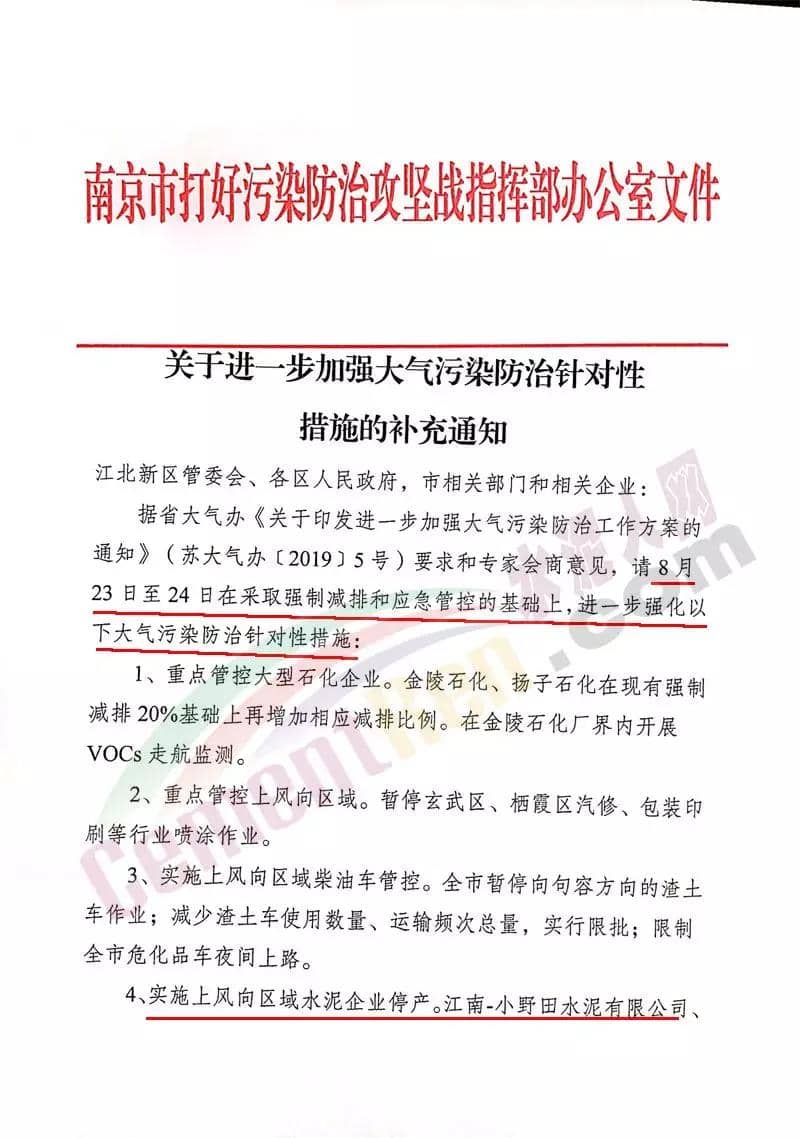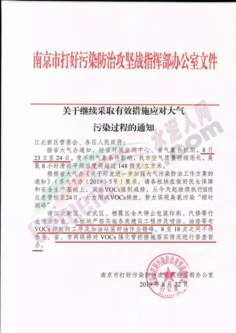 據(jù)水泥人網(wǎng)了解,就在前一日(8月22日),南京市打好污染防治攻堅戰(zhàn)指揮部辦公室發(fā)布《關(guān)于繼續(xù)采取有效措施應(yīng)對大氣污染過程的通知 》稱據(jù)省大氣辦通知,經(jīng)省環(huán)境監(jiān)測中心、省氣象臺預測,8月23日至24日,受不利氣象條件影響,市空氣質(zhì)量持續(xù)惡化,臭氧8小時滑動平均濃度將超過148微克/立方米。根據(jù)省大氣辦《關(guān)于印發(fā)進一步加在氣污染防治工作方案的通知》要要求,請各板塊在做好民生保障和安全生產(chǎn)基礎(chǔ)上實施強制減排,從22日起繼續(xù)執(zhí)行II級應(yīng)急管控至24日,努力實現(xiàn)臭氧污染“縮時削峰”。省、市兩級將對強化管控措施落實情況進行督查。