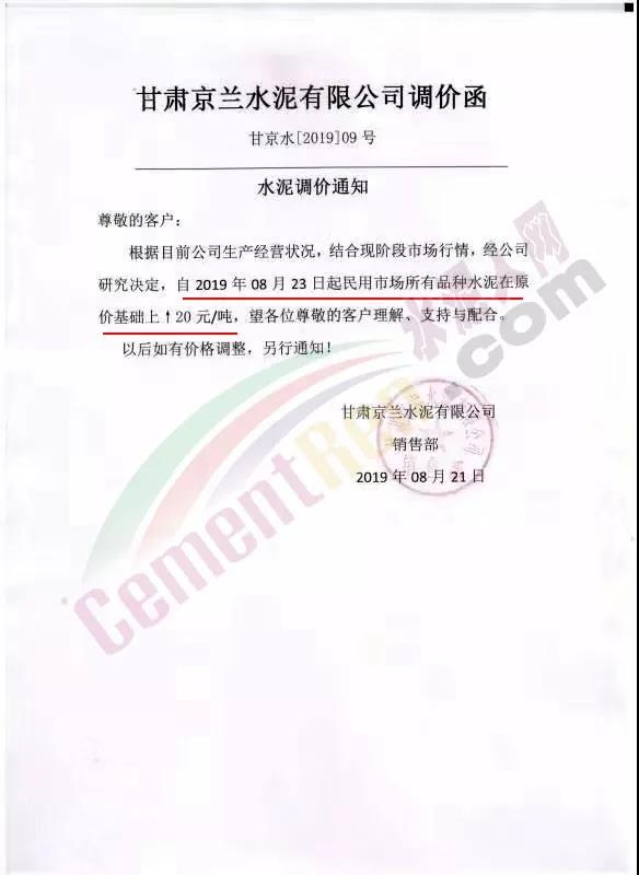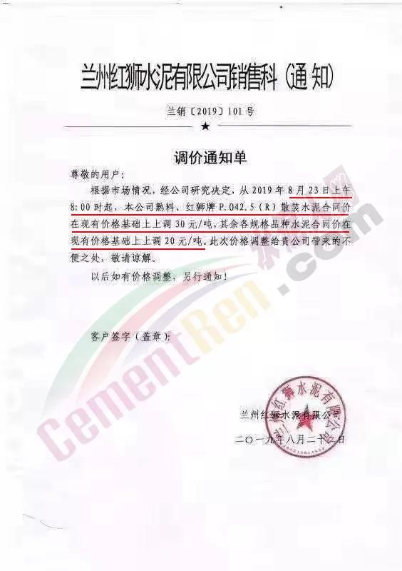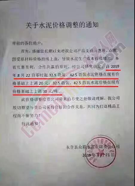 結合當前周邊市場行情,經公司商議決定自2019年8月22日上午9:30分整,32.5水泥袋裝、散裝在原價格基礎上每噸上調10元;42.5水泥袋裝、散裝在原價格基礎上每噸上調10元,特此通知!