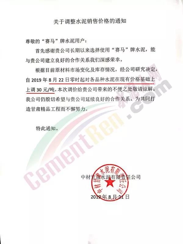 根據當前市場形勢經我公司研究決定,自2019年08月22日上午9:00點起所有水泥品種價格統一上調30元/噸。