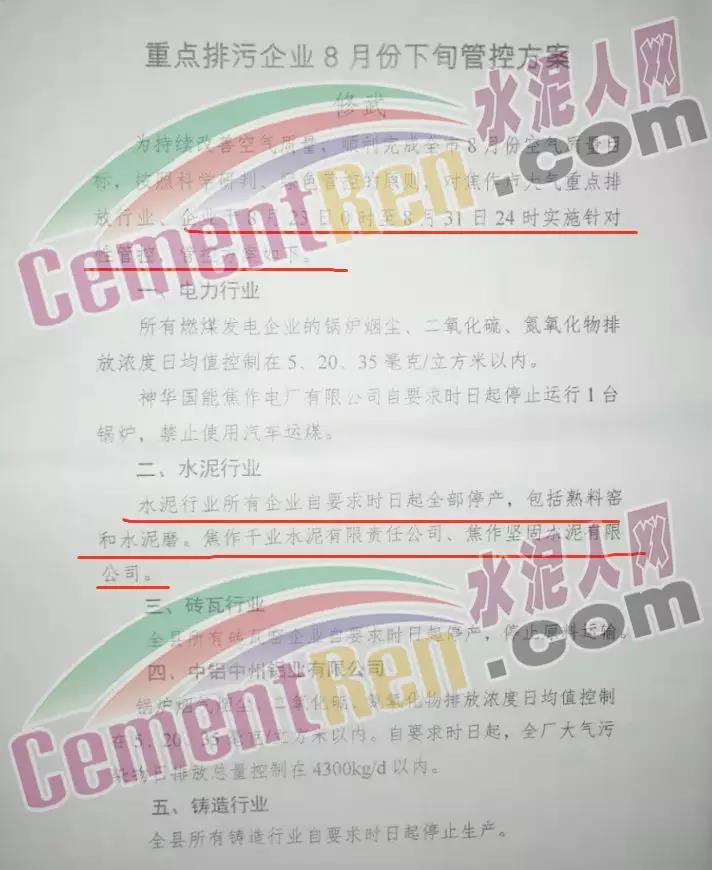 河南省焦作市相關(guān)部門近日發(fā)布的《重點排污企業(yè)8月份下旬管控方案》稱,對焦作市大氣重點排放行業(yè)、企業(yè)于8月23日0時至8月31日24時實施針對性管控,水泥行業(yè)所有企業(yè)自要求時日起全部停產(chǎn),包括熟料窯和水泥磨。