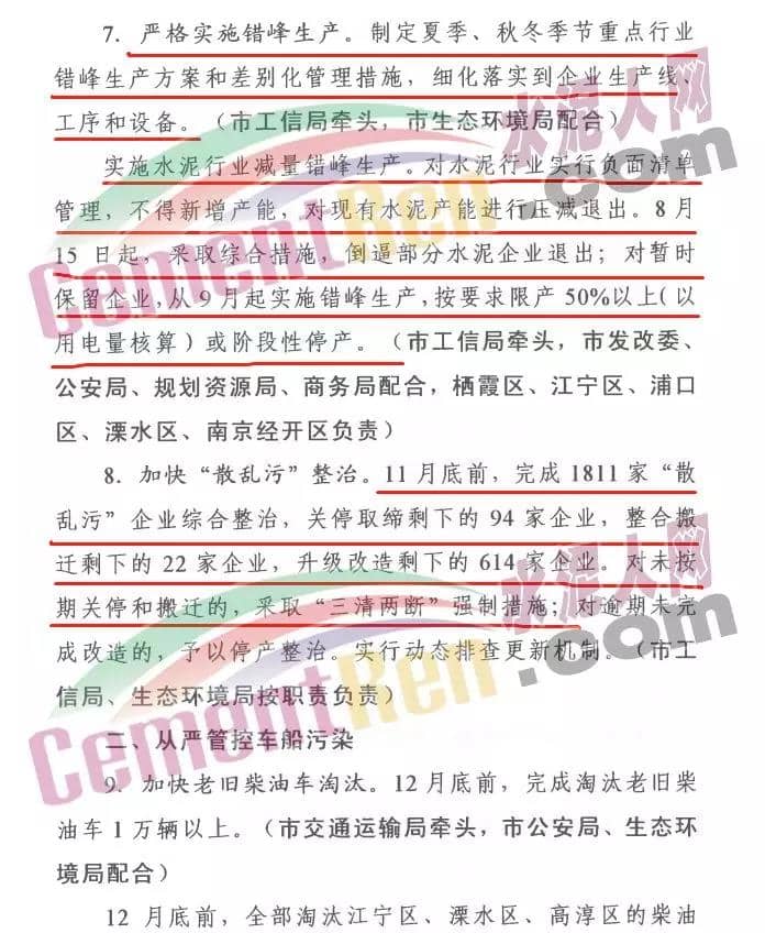 實(shí)施水泥行業(yè)減量錯(cuò)峰生產(chǎn)。對水泥行業(yè)實(shí)行負(fù)面清單管理,不得新增產(chǎn)能,對現(xiàn)有水泥產(chǎn)能進(jìn)行壓減退出。8月15日起,采取綜合措施,倒逼部分水泥企業(yè)退出;對暫時(shí)保留企業(yè),從9月份起實(shí)施錯(cuò)峰生產(chǎn),按要求限產(chǎn)50%以上(以用電量核算)或階段性停產(chǎn)。(市工信局牽頭,市發(fā)改委、公安局、規(guī)劃資源局、商務(wù)局配合,棲霞區(qū)、江寧區(qū)、浦口區(qū)、溧水區(qū)、南京經(jīng)開發(fā)區(qū)負(fù)責(zé))