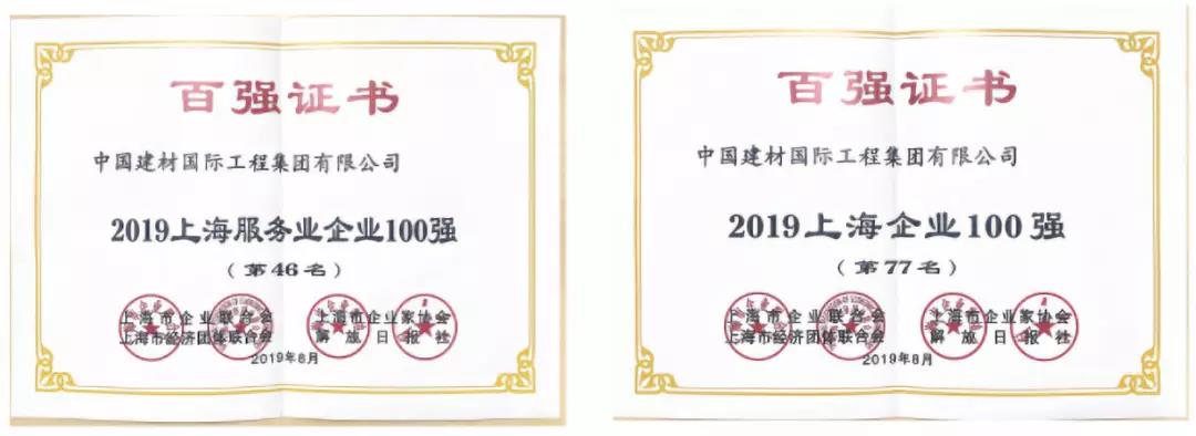 中國建材工程榮獲2019“上海企業(yè)100強”及“上海服務業(yè)企業(yè)100強”稱號