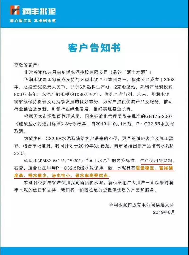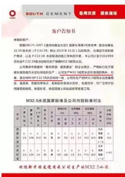 南方水泥客戶告知書稱,公司生產(chǎn)的M32.5砌筑水泥所使用的熟料、石膏、混合材料與PC32.5R水泥保持一致。