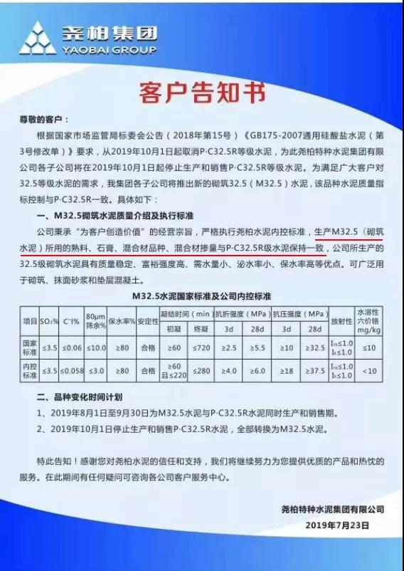 堯柏集團客戶告知書稱,堯柏集團推出的M32.5砌筑水泥質(zhì)量指標(biāo)控制與P.C32.5R保持一致。