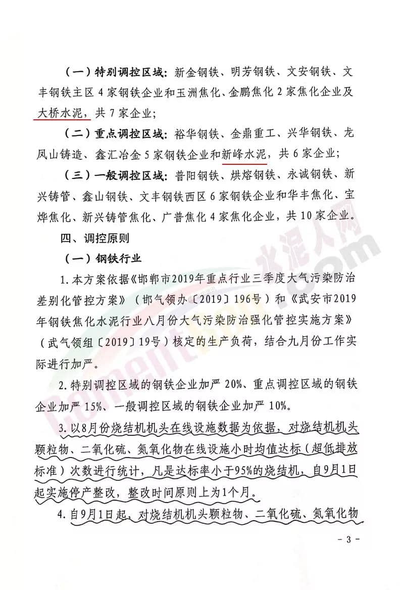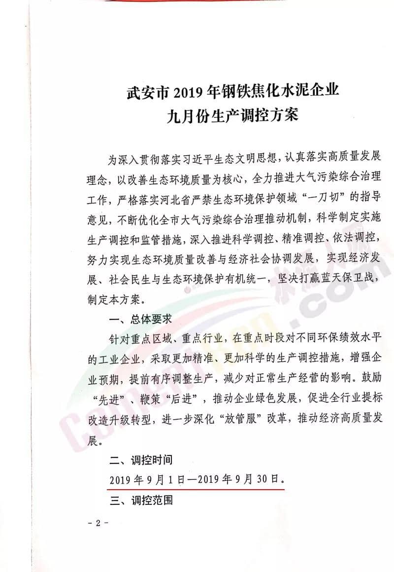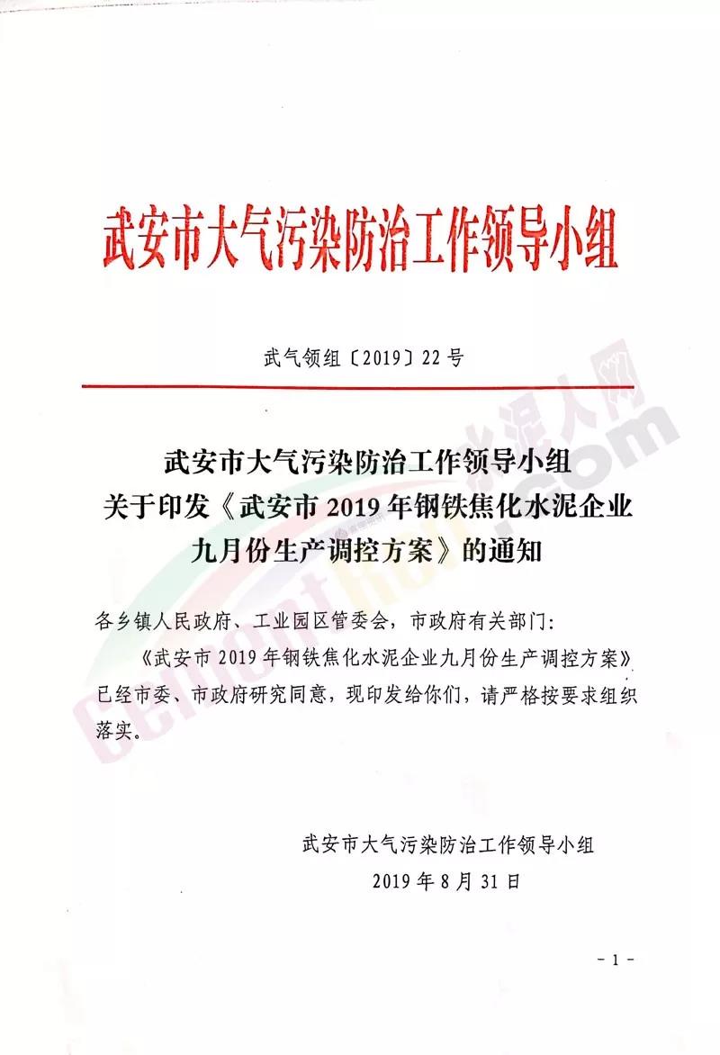 水泥人網消息:日前武安市大氣污染防治工作領導小組發(fā)布《武安市2019年鋼鐵焦化水泥企業(yè)九月份生產調控方案》稱自本月1日至月末(9月1日-9月30日)對鋼鐵、焦化及水泥等企業(yè)生產進行調控。其中特別調控區(qū)域共7家企業(yè),其中包括大橋水泥;重點調控區(qū)域為包括新峰水泥在內的6家企業(yè)。
